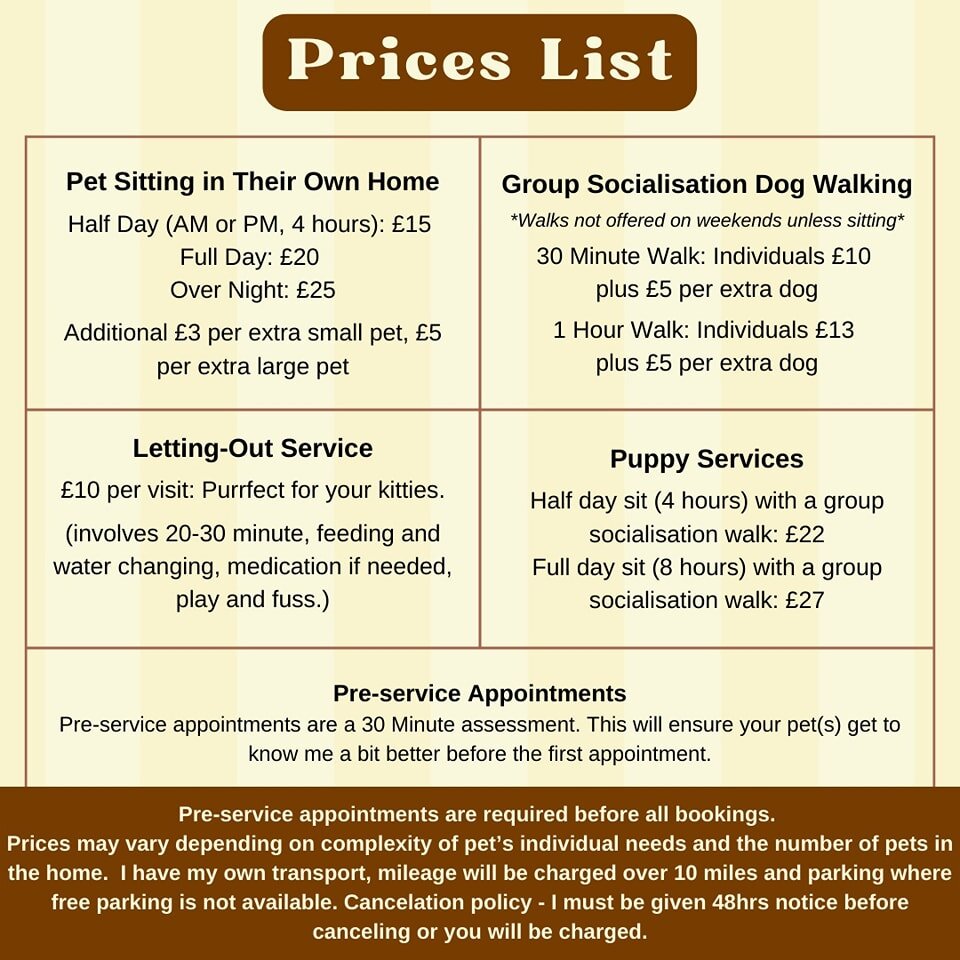 Pre-service appointments are required before all bookings. Prices may vary depending on complexity of pet's individual needs and the number of pets in the home. I have my own transport, mileage will be charged over 10 miles and parking where free parking is not available. Cancellation polity - I must be given 48hrs notice before cancelling you will be charged.